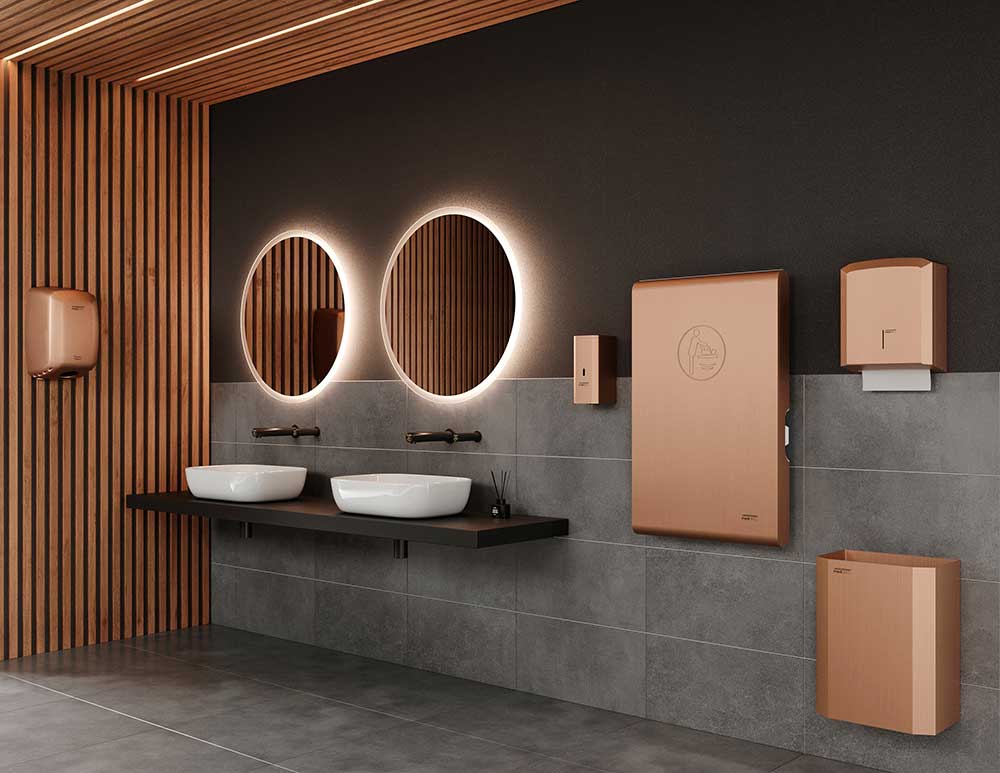 The new PVD finishes are available for a variety of Mediclinics’ key products, including hand dryers, soap dispensers, and other essential washroom accessories. This range offers a choice of sophisticated colors and tones, including gold, copper, bronze and anthracite allowing designers and facility managers to achieve a cohesive, upscale look. The sleek finishes make the products ideal for luxury hotels, high-end restaurants, and modern office buildings where both functionality and aesthetics are paramount.